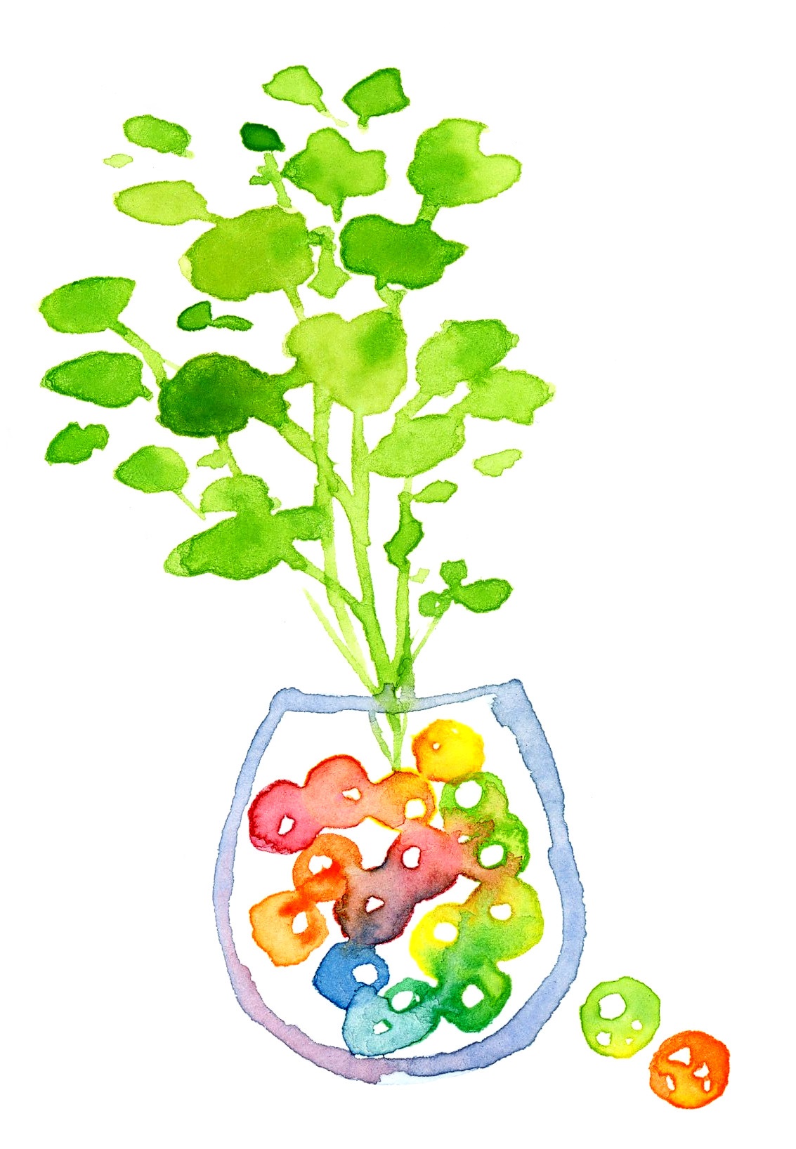 もっと涼し気に見せたいときは、土の代わりに植物用ジェリーボールを使ってみましょう。ジェリーボールとは高吸収性ポリマーを使用した吸水・保存材料のこと。詳しい使い方については、次の文章でご紹介します。