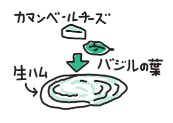 ④ 生ハムの真ん中にバジルの葉とカマンベールチーズを置きます。