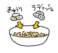③ きゅうり、ラディッシュは薄い輪切りにし、飾り用に数枚取り分けておきます。