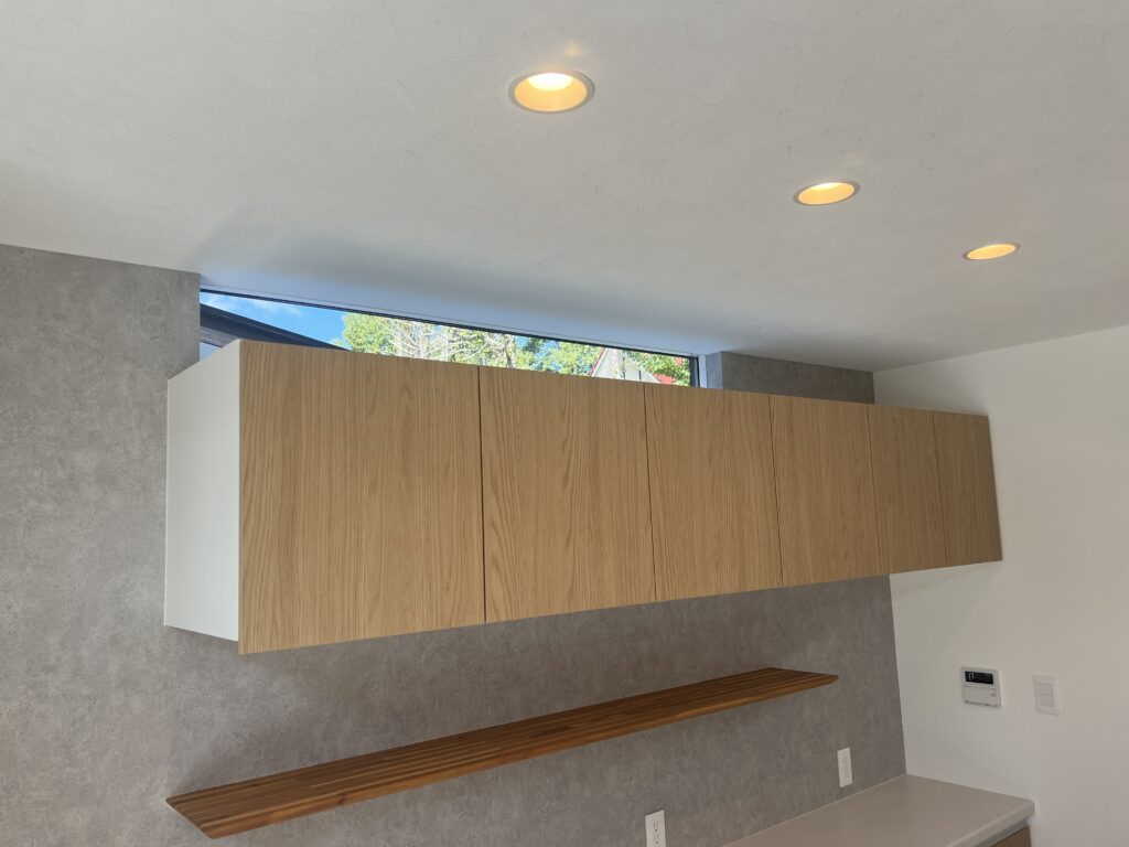 さらに、S様のご提案で採用した天井付けの横長の窓が、空間に独特のアクセントを加えています。外の光を効果的に取り込みながらも、自然と調和したデザインが印象的で、開放的な雰囲気を引き立てています。