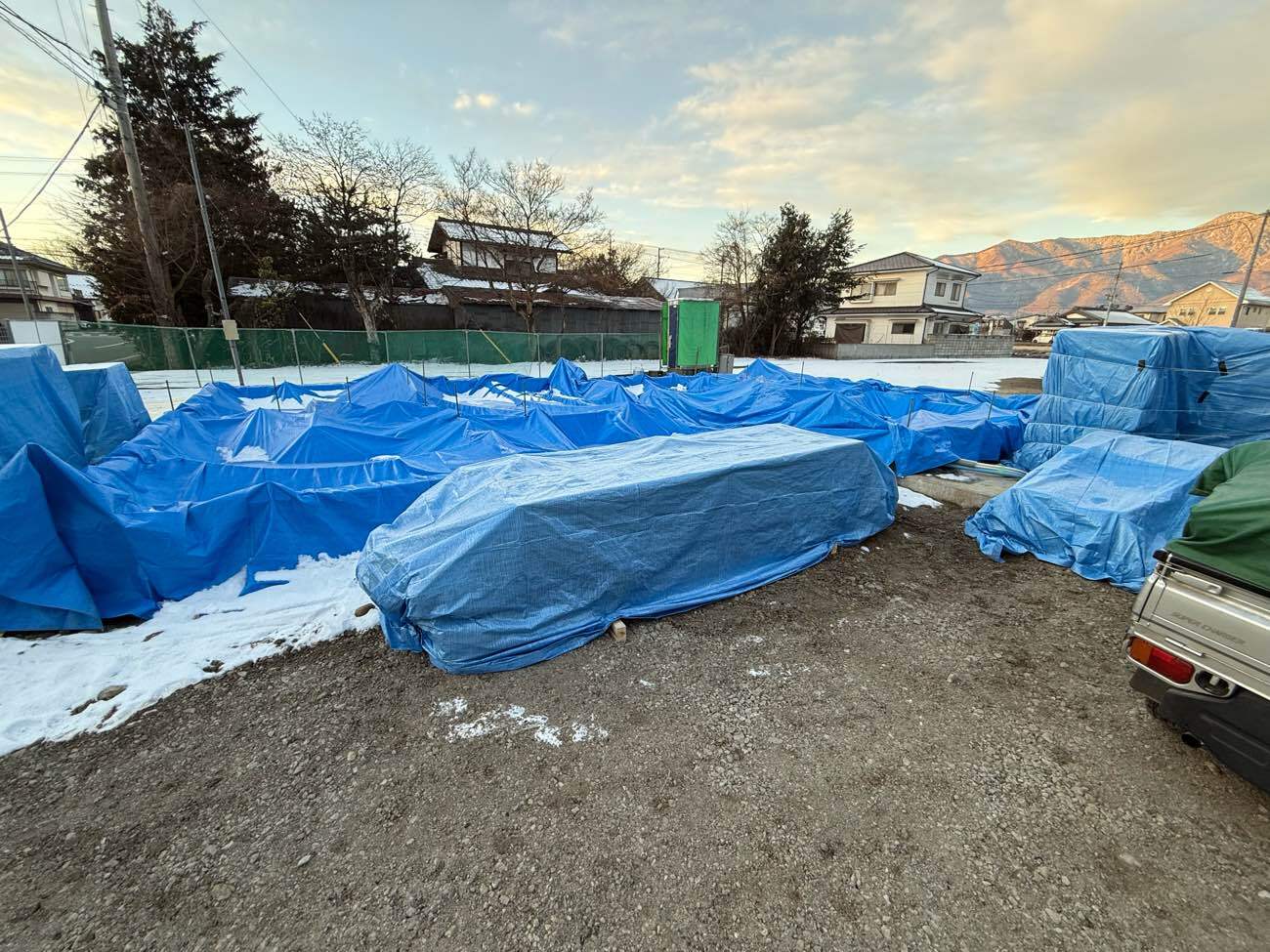 作業ごとに 降雪対策で シート養生が欠かせない。