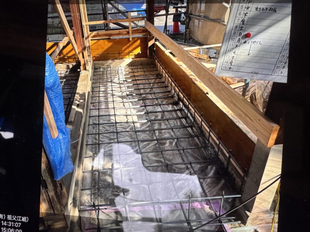 その下に 鉄筋、型枠を入れてから コンクリート流す、 基礎が出来あがると