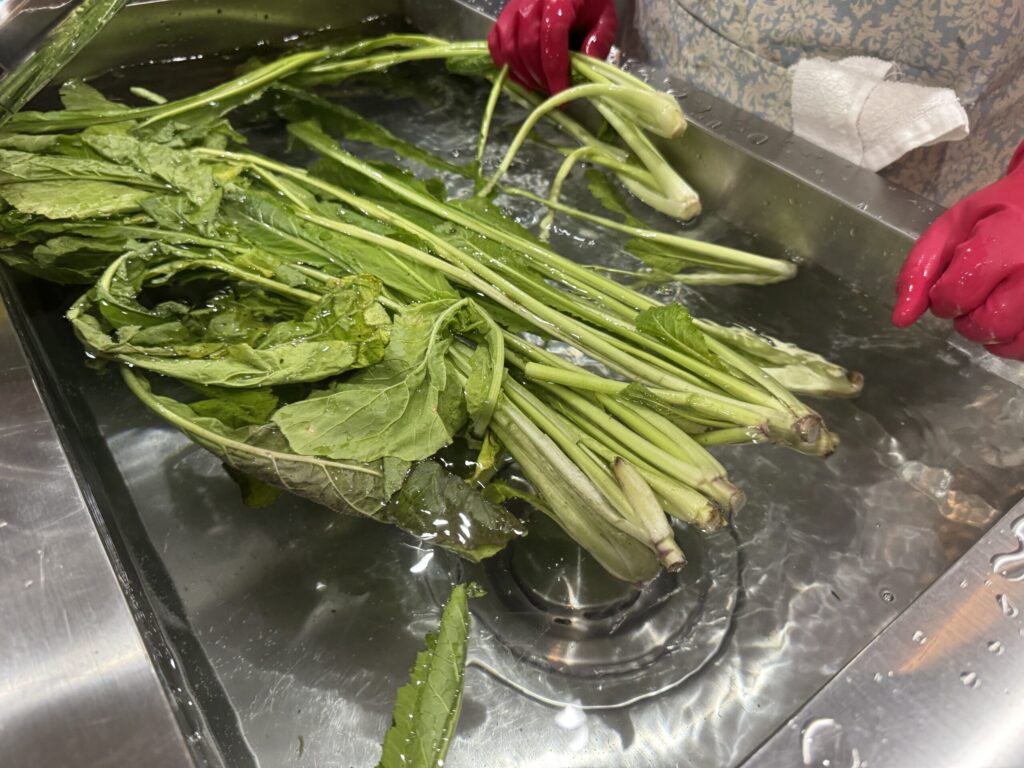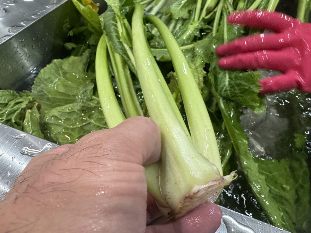 えーーと 漬ける工程は 野沢菜を洗う、茎のあたりに土がついているため、