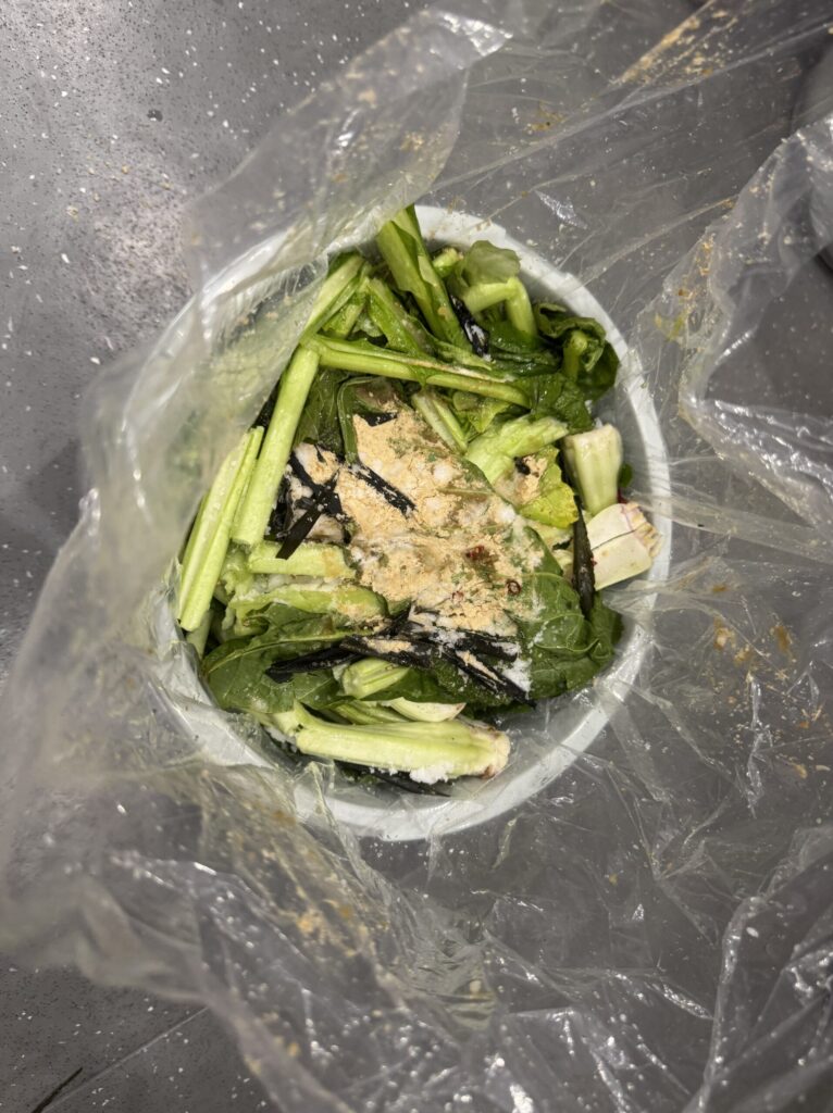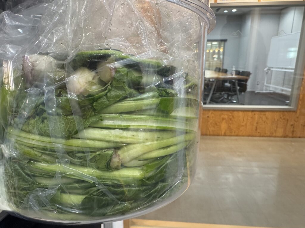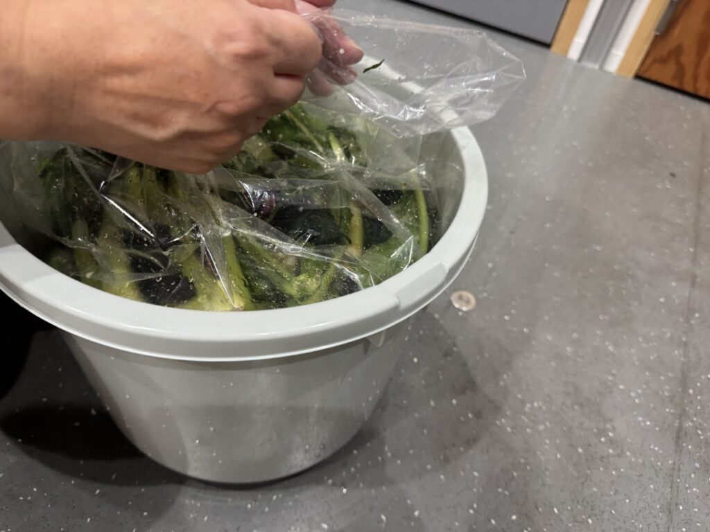 その後に バケツに 野沢菜を入れていく 隙間がないように、詰めていきます