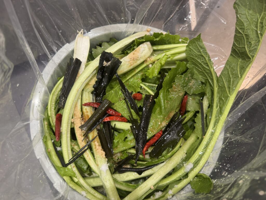 緑の野沢菜に 鷹の爪の赤が 映えますね、 味はどうなるか 知らないですが。