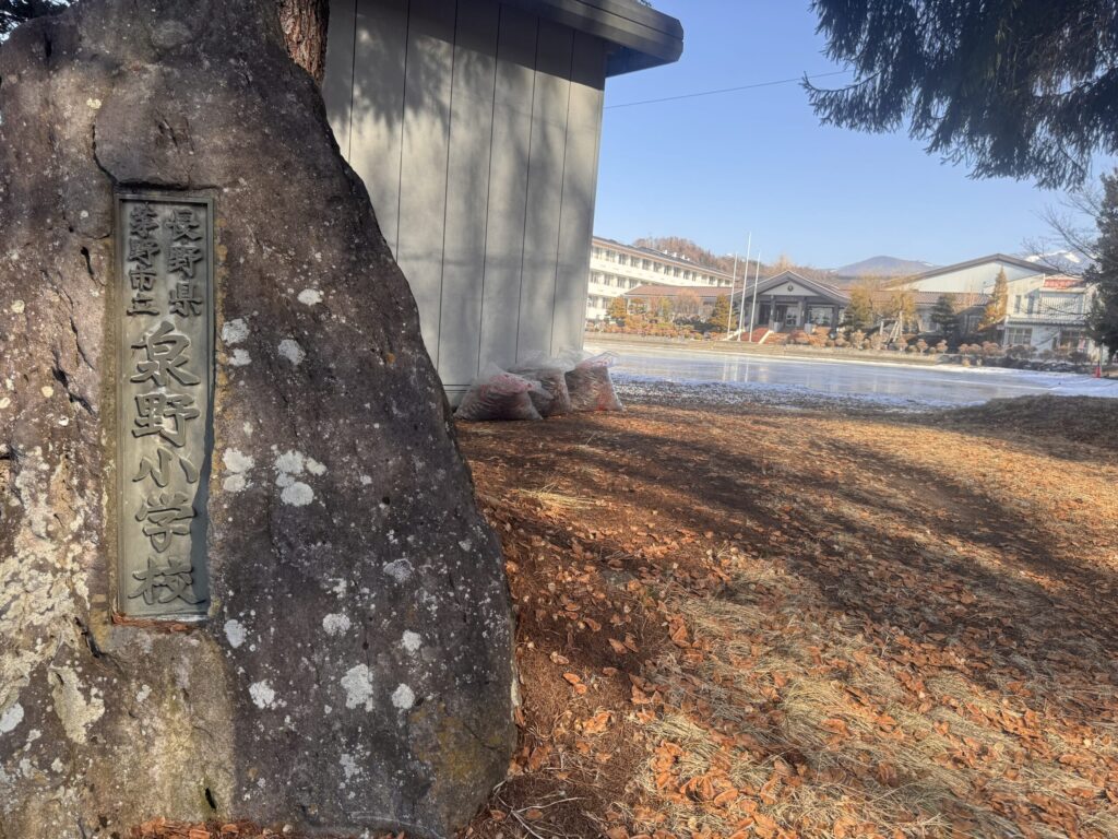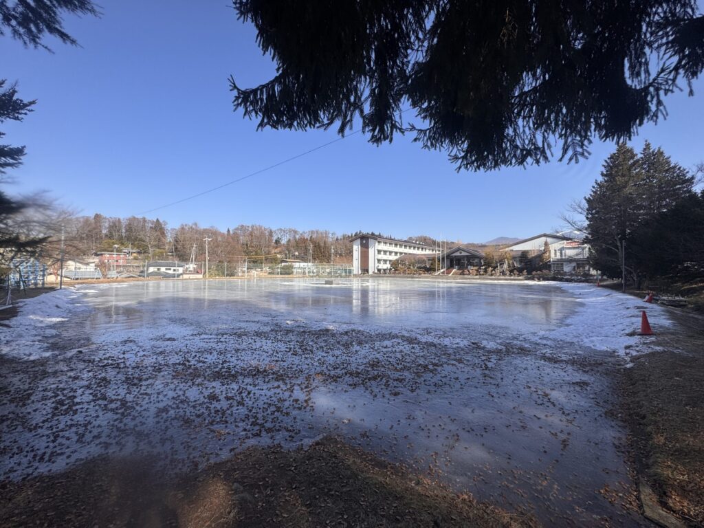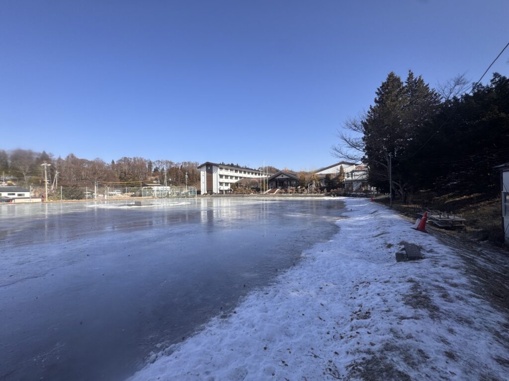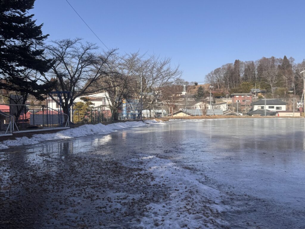 ですが、まだ ここ 茅野市泉野小学校では  校庭に水を張って スケートリンクを