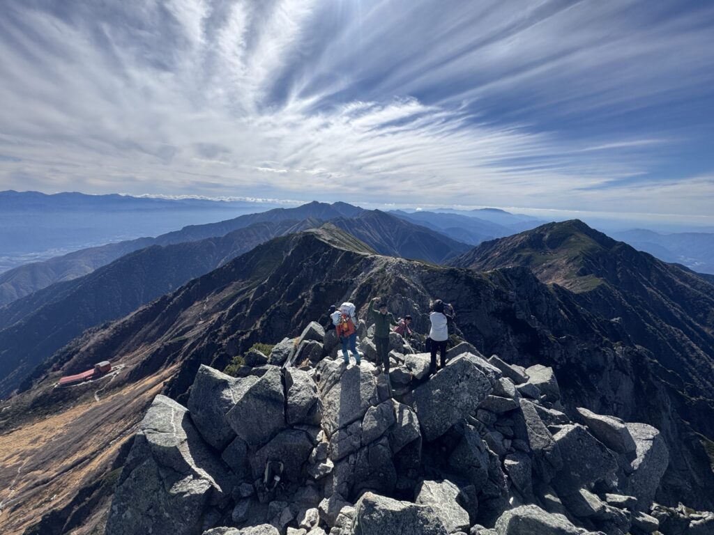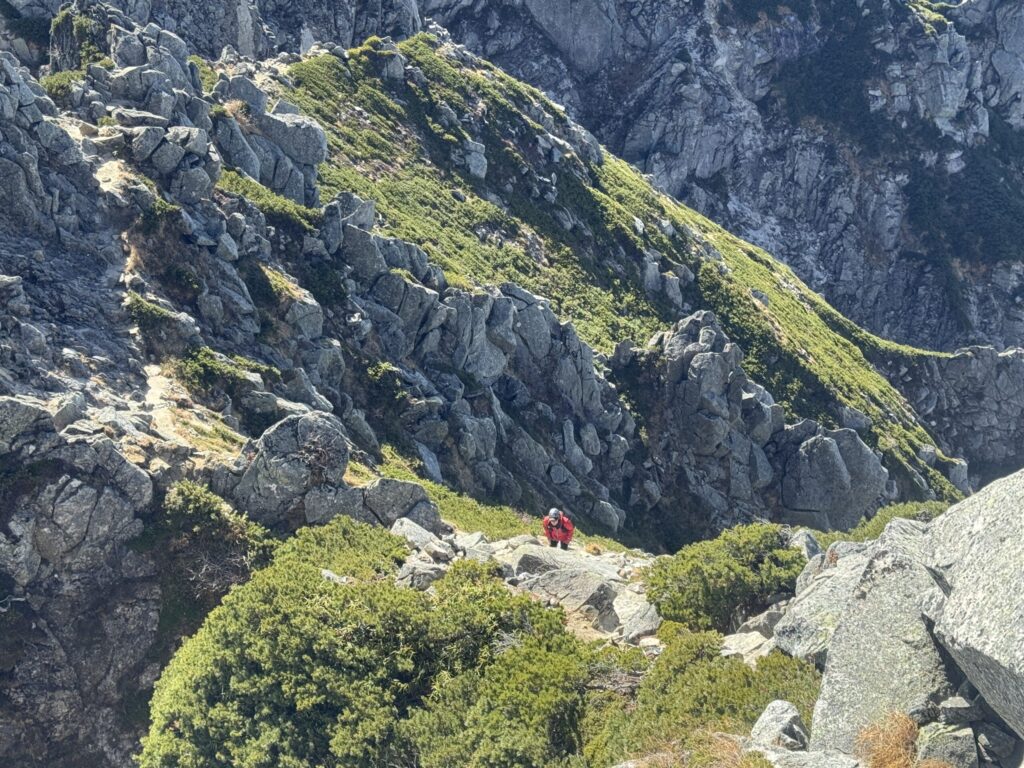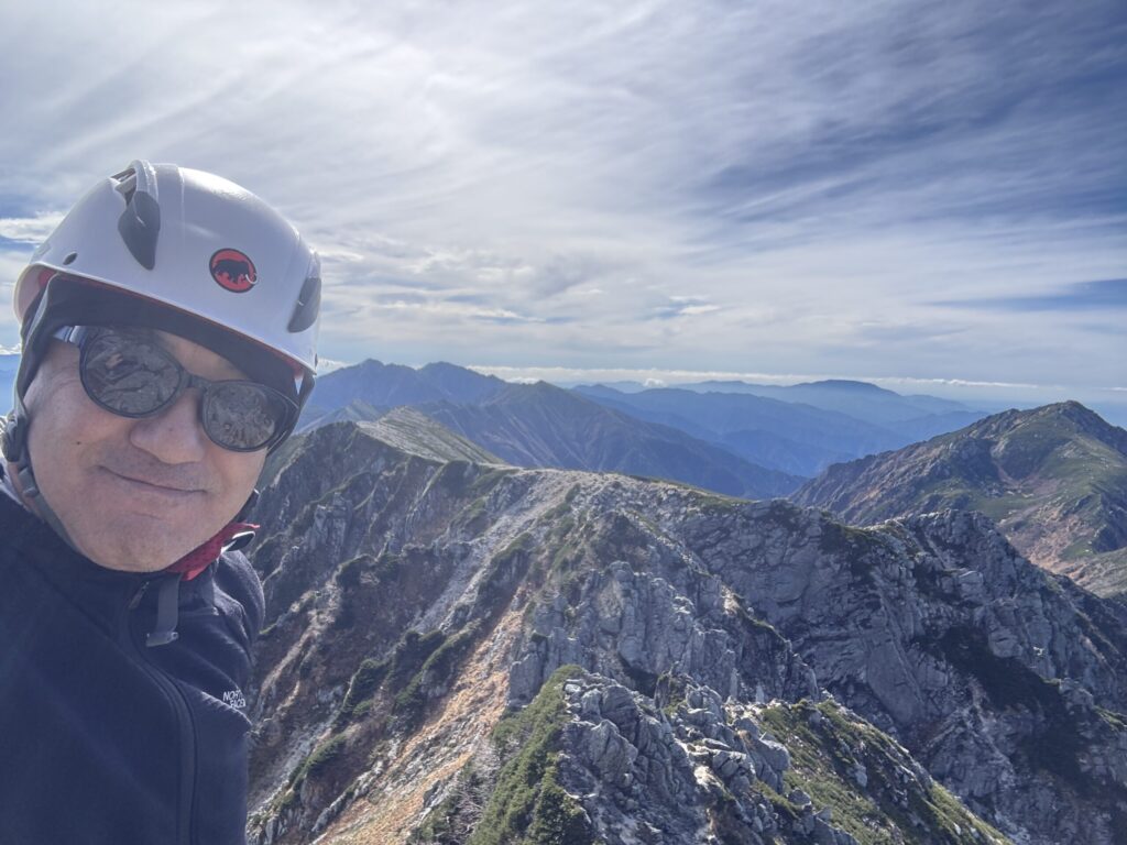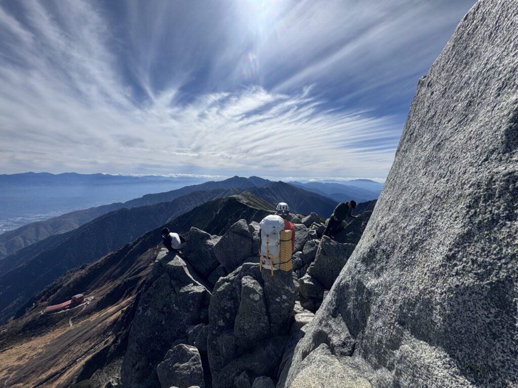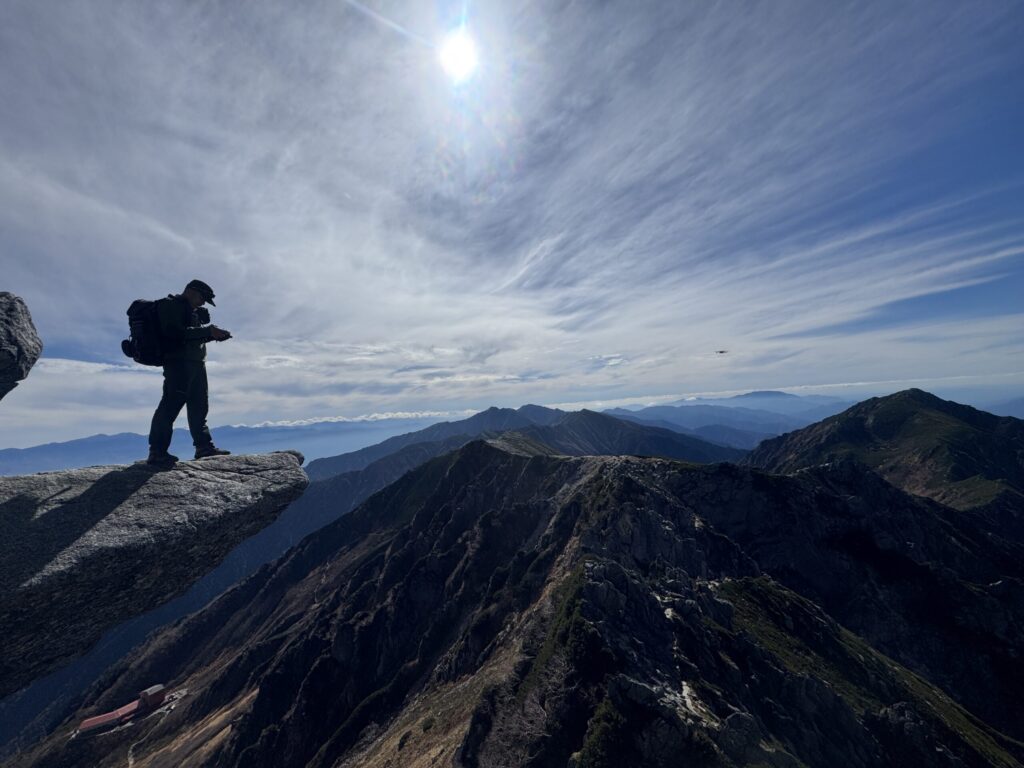 ツーンと突き出した岩の上で 撮影をする。です。 宝剣岳から木曽駒ヶ岳方面とは