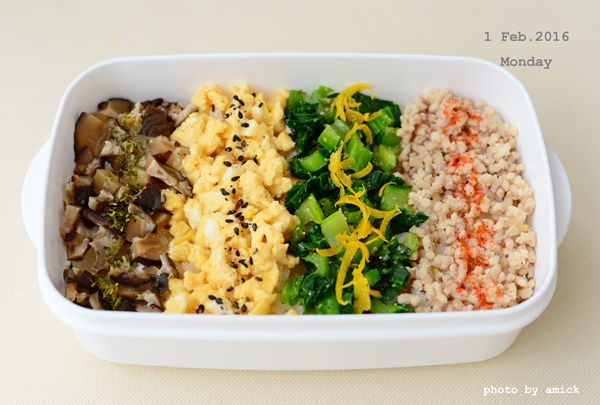 (卵・塩麹そぼろ・小松菜のお浸し・干し椎茸の甘辛煮・プチトマト)