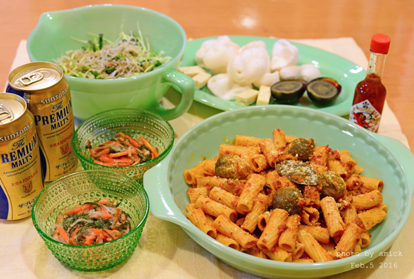 2月6日 土曜日 芽キャベツと豚のトマトトルティリオーニ&アカモクと人参のたらこ和え