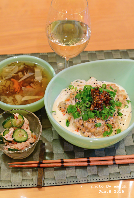 レシピは、炒めたひき肉をのっけた坦々麺として載ってたのだけど、もっとお手軽に納豆をのっけてみたけど、思った通り、超美味しかった〜〜。