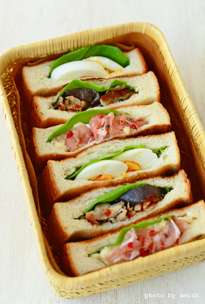 どなたかのレシピで見かけた、4枚切り食パンの中を開いて具を詰めるidea♪ 一目見て、これは近々試してみたい〜!と思い、サンドイッチ系のリクエストをもらってた部活の大会に採用。