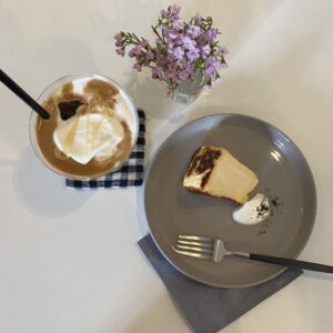 おやつタイムの滞在でしたので、カフェ・ラテとバスクチーズケーキを注文。アイスのカフェラテは、甘さなどお好みに合わせて調節可能。ミルクも、ソイやオーツミルクなどの植物性ミルクのラインナップがあります。また、カフェ・モカ、黒糖ラテ、はちみつラテなど好みの甘さのバリエーションがあります。