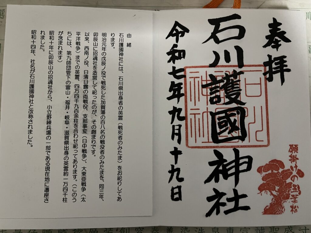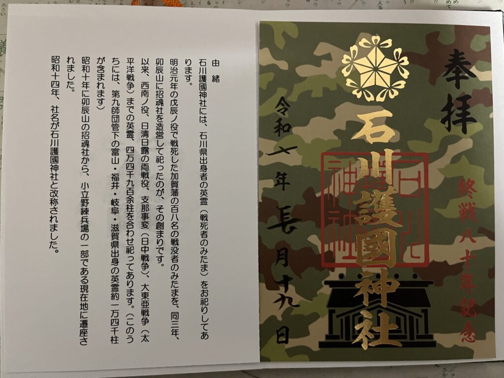 石川護国神社では、終戦80周年記念の限定御朱印も