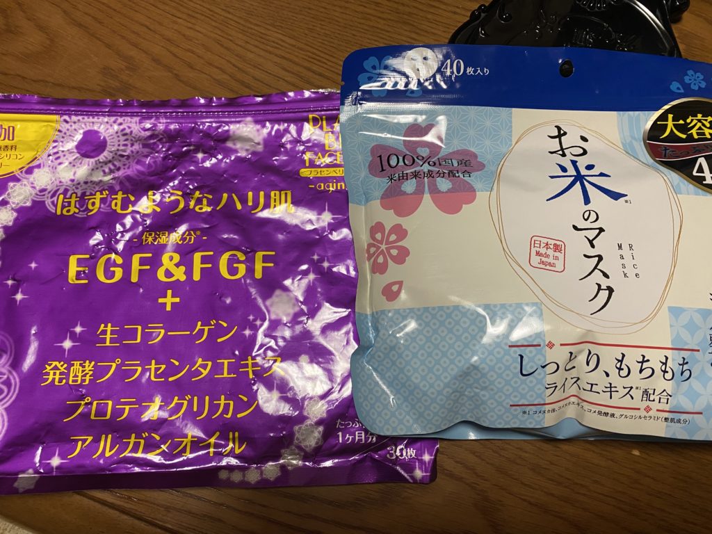 左の紫のパッケージが、いつも使っているマスクで