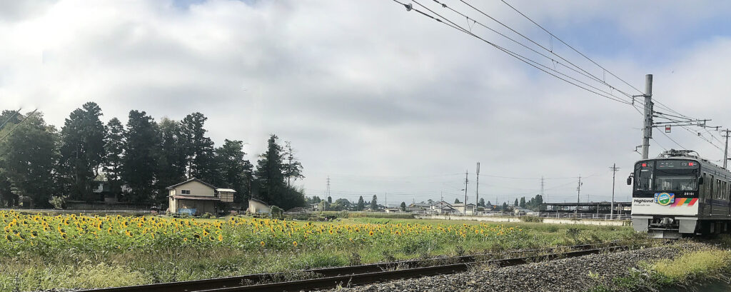 上高地線の線路のすぐわきのひまわり畑。ひまわりはいつ見ても、元気づけられますね。