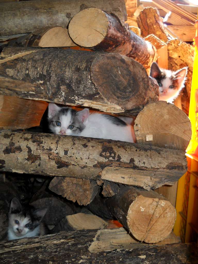 おはようございます。子猫ちゃん3匹がタワーみたいなマキで隠れんぼしたり楽しんで遊んでるね。